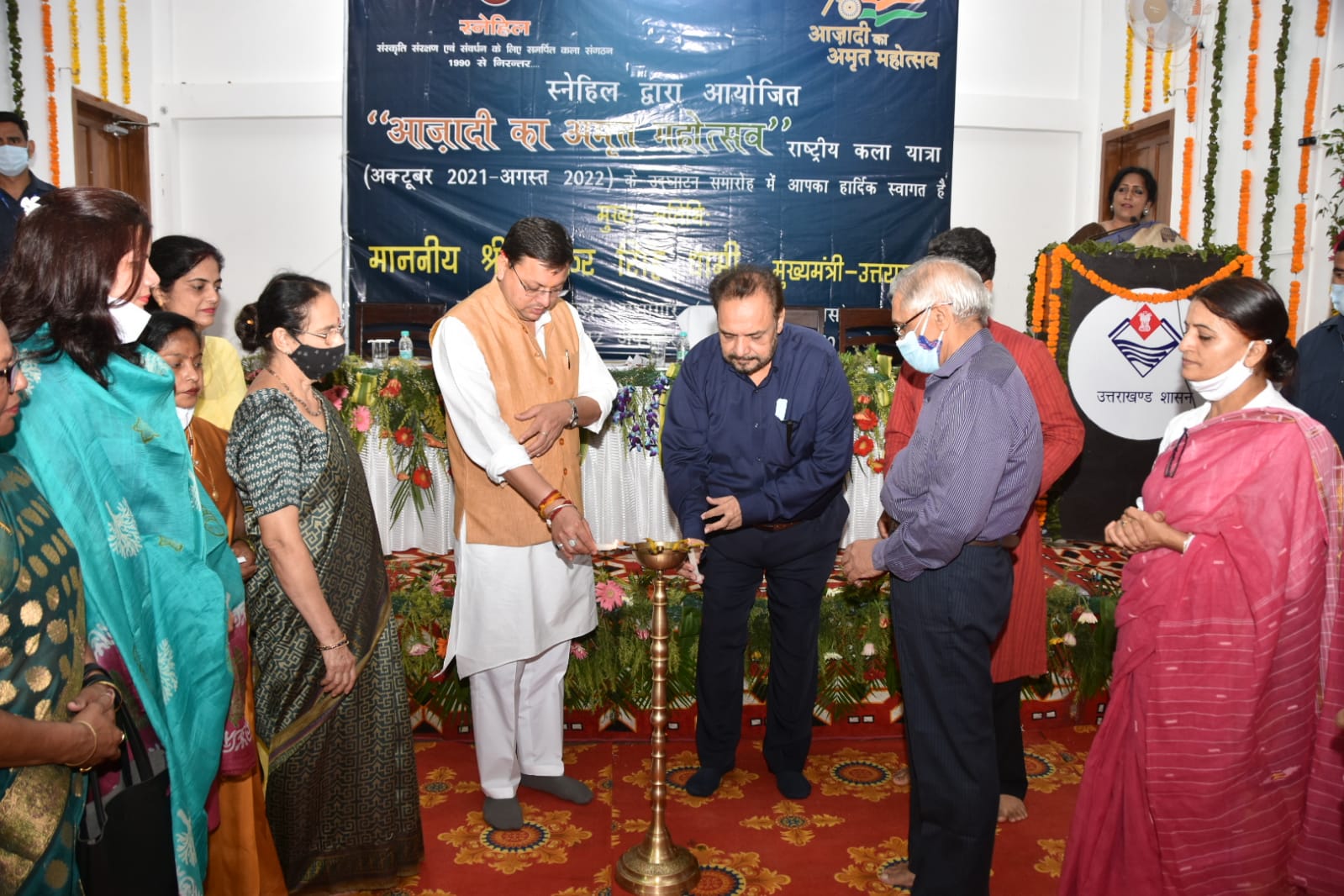 मुख्यमंत्री श्री पुष्कर सिंह धामी ने मंगलवार को मुख्यमंत्री आवास स्थित जनता दर्शन हॉल में स्नेहिल संस्था द्वारा आयोजित आजादी का अमृत महोत्सव राष्ट्रीय कला यात्रा के उद्घाटन समारोह में मुख्य अतिथि के रूप में प्रतिभाग किया