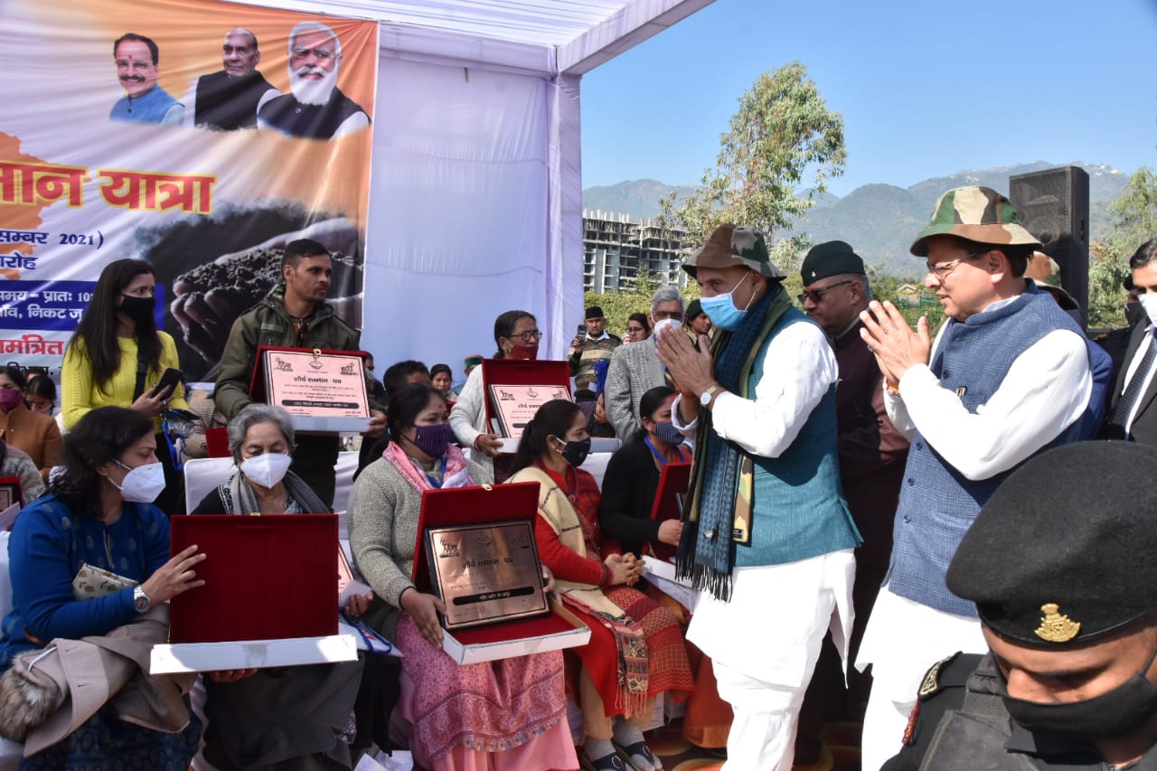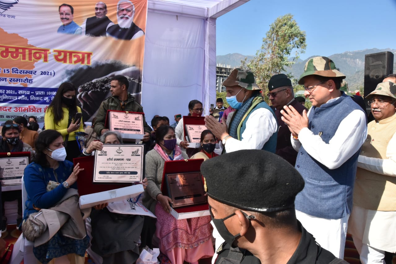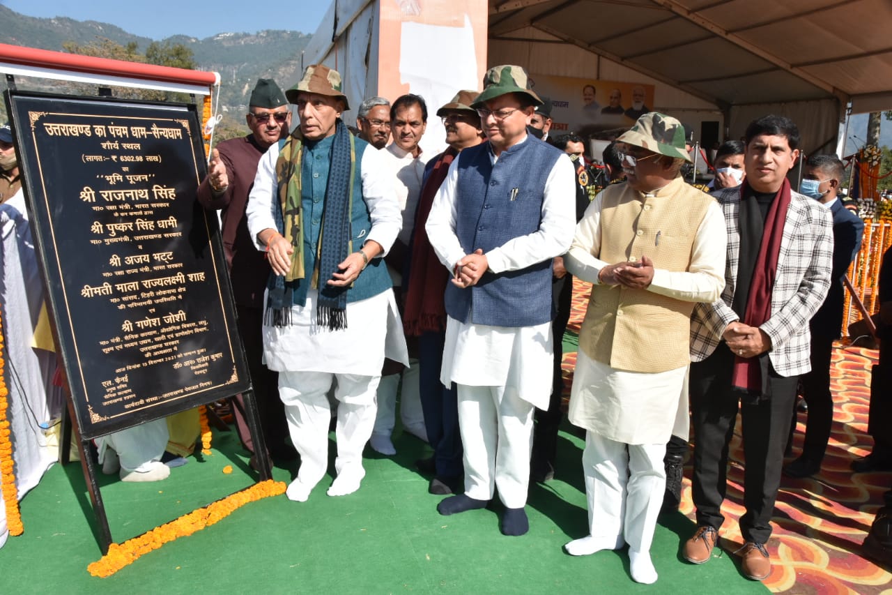 केंद्रीय रक्षा मंत्री श्री राजनाथ सिंह और मुख्यमंत्री श्री पुष्कर सिंह धामी ने बुधवार को गुनियाल गांव, देहरादून में लगभग 63 करोड़ रूपए की लागत से बने रहे भव्य सैन्य धाम का भूमि पूजन किया। इस अवसर पर शहीद सम्मान यात्रा का विधिवत समापन भी किया गया। रक्षा मंत्री श्री राजनाथ सिंह एवं मुख्यमंत्री श्री पुष्कर सिंह धामी द्वारा सैन्यधाम हेतु प्रदेश के प्रत्येक शहीद परिवार के आंगन से लाई गई पवित्र मिट्टी को कलश में डाला गया। साथ ही वीर शहीदों के परिजनों से मुलाकात कर तथा उन्हें शौर्य सम्मान पत्र प्रदान देकर सम्मानित भी किया गया।