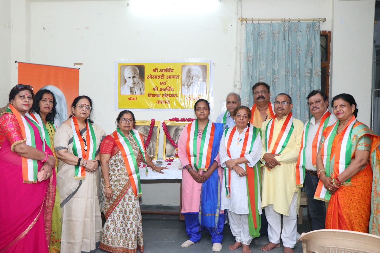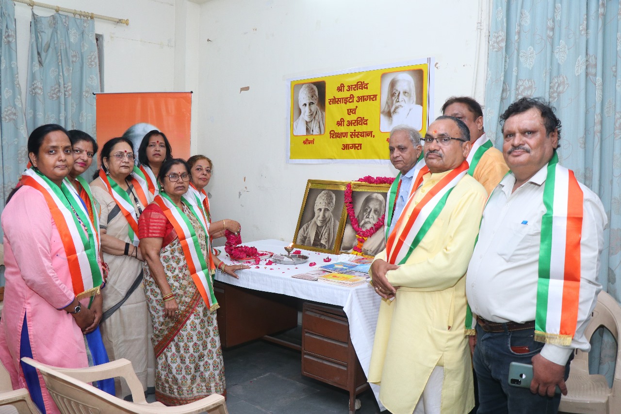 श्रीमां एवं श्री अरविंद चित्रों पर माल्यार्पण से शुभारंभइससे पूर्व कार्यक्रम का शुभारंभ अतिथियों ने श्री मां एवं श्री अरविंद के चित्रों पर माल्यार्पण और दीप प्रज्जवलित कर किया। साहित्यकार श्री विश्वेश्वर दयाल द्वारा रचित राष्ट्रभक्ति के गीत प्रस्तुत किए गए। संस्था की सचिव पवित्रा अग्रवाल ने आभार व्यक्त किया।